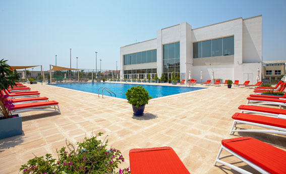 The club features a state-of-the-art gym, swimming pool, restaurant with indoor and outdoor poolside seating, and more.